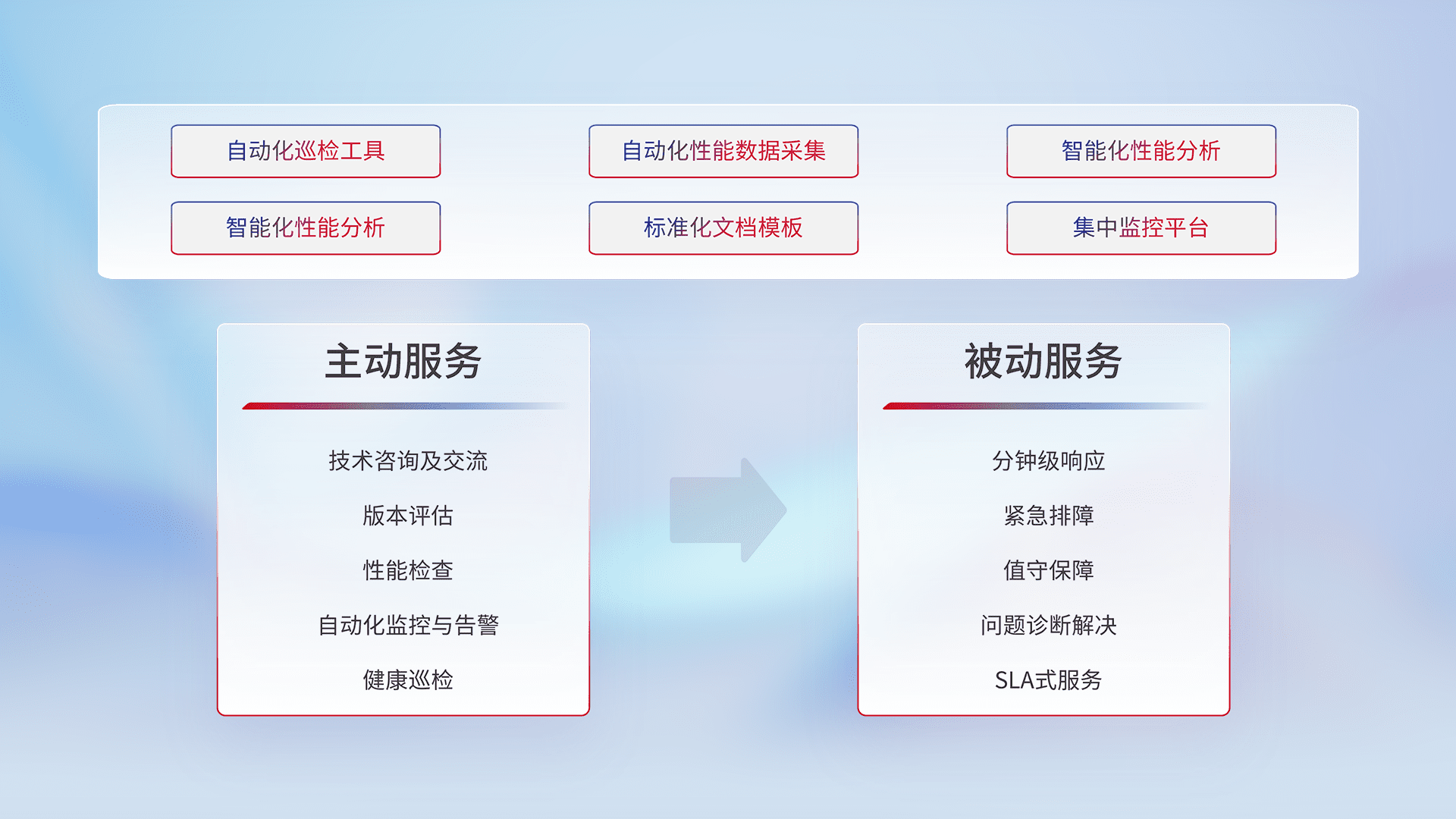 智能化工具和标准化文档,,,,保障服务质量,,提供主动服务(包含技术咨询、、、、版本评估、、、、性能检查、、、自动化监控与告警、、健康巡检)和被动服务包含(分钟级响应、、、紧急排障、、、值守保障、、、、问题诊断解决、、SLA服务)。。。。