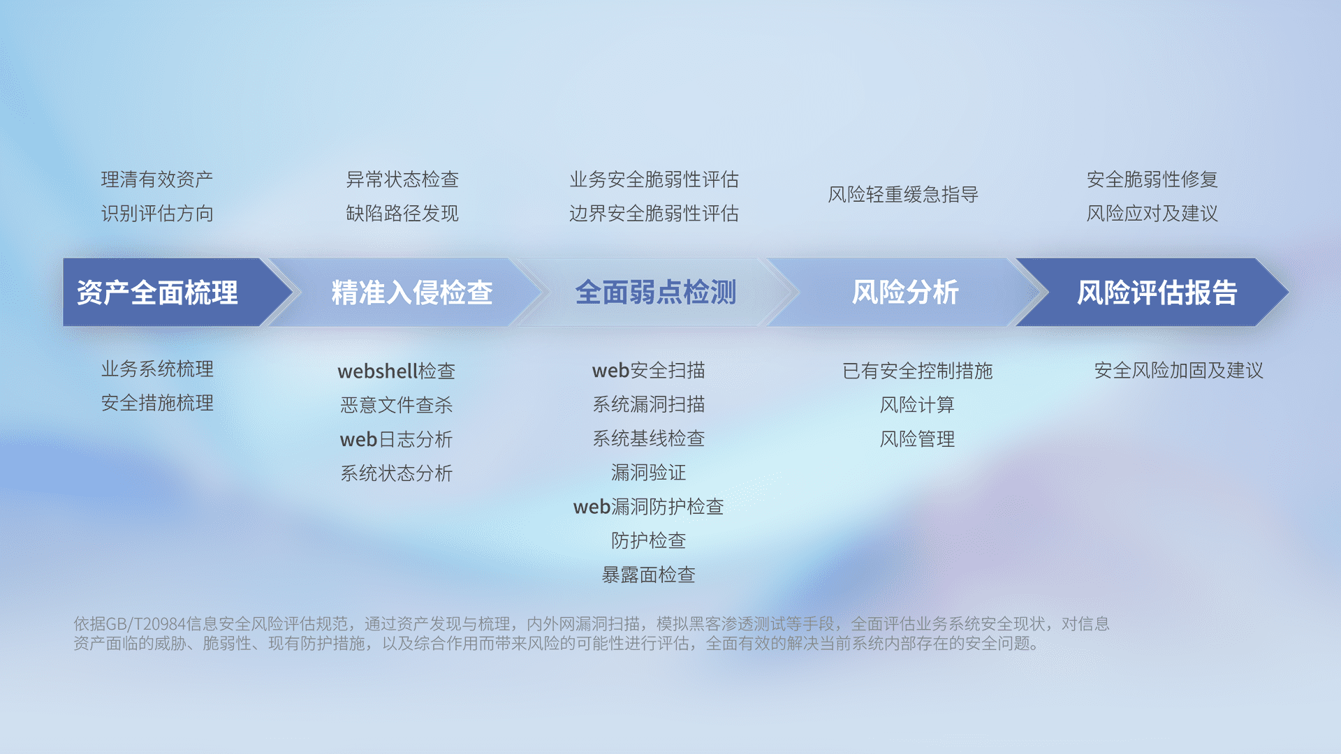针对客户行业特性,,,,以专业的安全服务+多厂商联合解决方案提供专属的一站式安全管理服务,,帮助客户全面感知网络空间威胁,,基于识别、、检测、、分析、、防护、、、、监测、、、响应的服务理论模型,,,,从方案咨询、、集成交付、、评估验证、、优化加固、、、运维运营,,致力于为客户提供完整的闭环管理式安全服务。。。。以实战经验为客户打造高抵御风险的安全体系,,帮助客户发现威胁、、、、对抗威胁、、、处置威胁,,,不断积累安全对抗能力,,持续保障数字化安全。。
